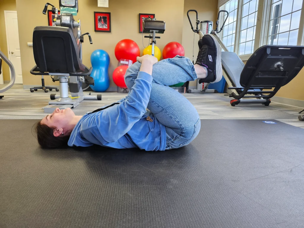 Start on your back with your knees bent. Slowly bring both knees to your chest. Grasp your knees. Hold for 30 seconds and repeat.