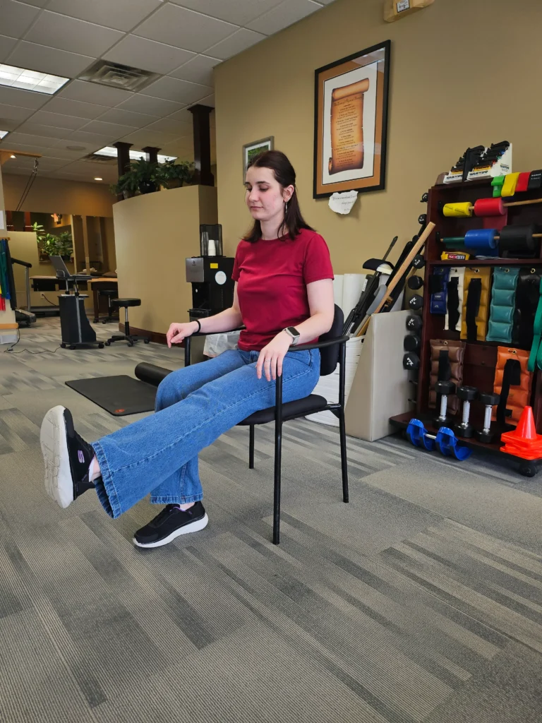 Sit in a sturdy chair with your back straight. Slowly straighten one leg out in front of you, hold briefly, then lower it back down. Alternate legs to strengthen your thighs and improve knee function.