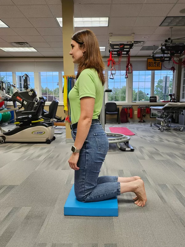 Start by kneeling on a foam pad with your butt on your heels and your torso standing tall. Drive your hips forward to go into a tall kneeling position with your hips locked out; hold a few seconds then lower back to kneeling with control. 3 sets, 10 reps.