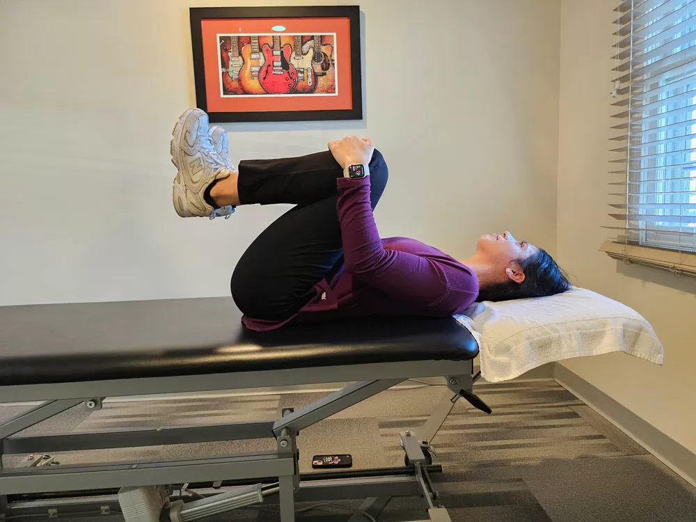 Start on your back with your knees bent. Slowly bring both knees to your chest. Grasp your knees. Hold for 30 seconds and repeat.
