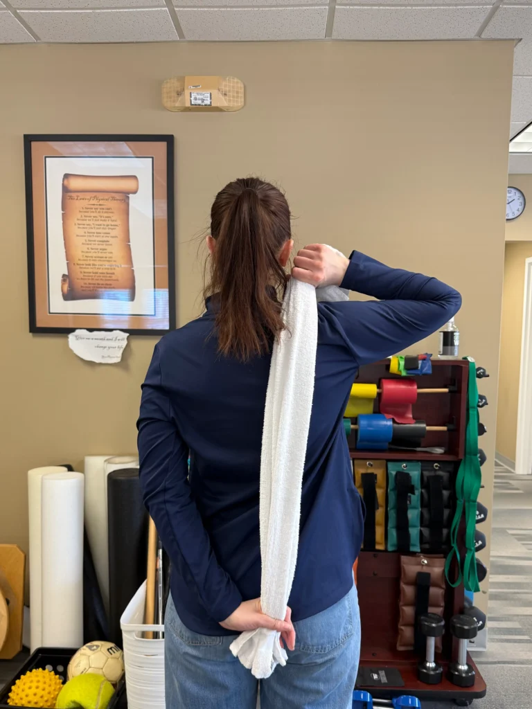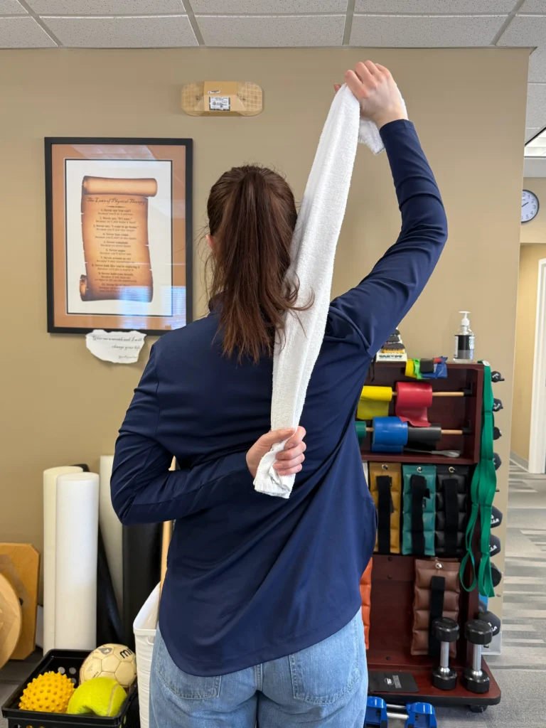Start by standing up straight, holding a towel behind your back with one end over your shoulder and the other by your lower back. Grab the bottom end of the towel with your hand on the side you want to stretch and gently pull up on the towel with your other hand. Hold for 30 seconds. 2 Sets, 1 Rep. (Materials needed: towel)